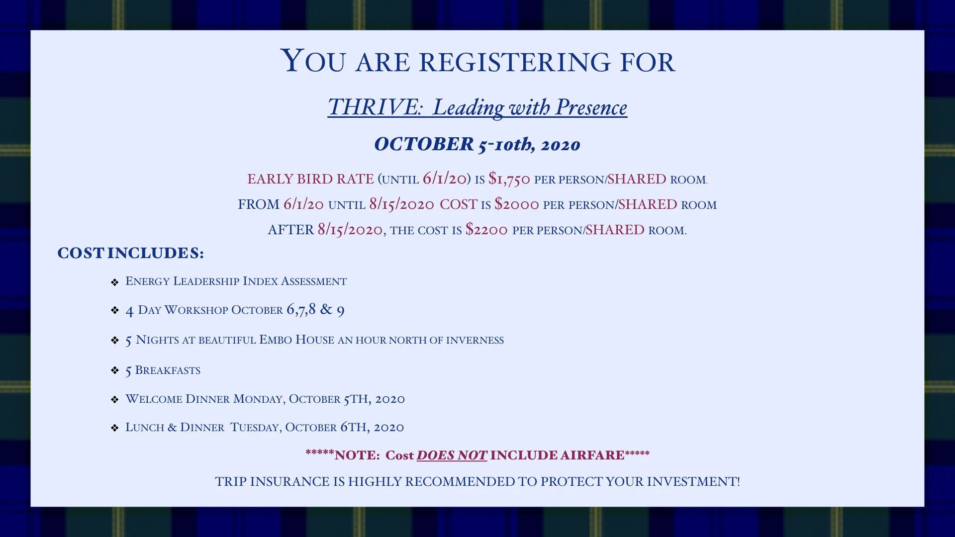BY ENTERING YOUR NAME BELOW, YOU ACKNOWLEDGE THAT YOU HAVE READ AND UNDERSTAND WHAT IS INCLUDED IN THE COST AND THAT TO SECURE A SPACE IN THRIVE: LEADING WITH PRESENCE, YOU MUST SUBMIT A $1000 NON-REFUNDABLE DEPOSIT. THERE WILL BE NO EXCEPTIONS TO THIS REFUND POLICY. THE ONLY WAY TO RECOVER YOUR FUNDS IS TO HAVE SOMEONE TAKE YOUR PLACE IN THE PROGRAM. THE REMAINING BALANCE WILL BE DUE IN EARLY AUGUST.